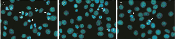 | A: shRNA; B: shRNA-C; C: Control 图 4 CDDP干预后各组SIHN-005A细胞Hoechst33258染色凋亡形态观察 (×200) Figure 4 Apoptosis morphology of SIHN-005A cells after CDDP administration detected by Hoechst33258 staining (×200) |