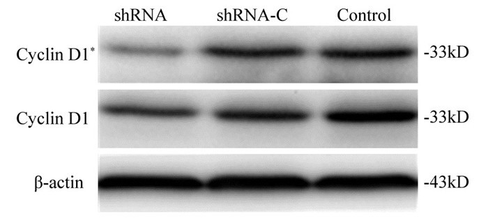 | *: after CDDP administration 图 5 Western blot检测CDDP作用前后SIHN-005A细胞Cyclin D1蛋白的表达 Figure 5 Expression of Cyclin D1 protein in SIHN-005A cell before and after CDDP administration detected by Western blot |