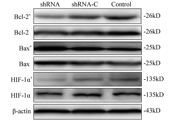 Western blot检测结果显示加用CDDP后,Bax蛋白在shRNA组中的表达(2.78±0.17)较shRNA-C组(0.93±0.22)(F=249.115, P=0.000)及Control组(0.89±0.16)(F=359.243, P=0.000)明显增强;Bcl-2蛋白加用CDDP后在shRNA组中的表达(0.21±0.07)较shRNA-C组(0.54±0.07)(F=521.732, P=0.000)及Control组(0.79±0.21)(F=26.977, P=0.007)明显抑制;HIF-1α加用CDDP后在shRNA组中的表达(0.60±0.29)较shRNA-C组(1.25±0.56)(F=11.001, P=0.029)及Control组(1.39±0.22)(F=14.563, P=0.019)显著下调(P < 0.05),在加入CDDP实验组与未加CDDP实验组Bax(1.69±0.24)(F=81.348, P=0.001)、Bcl-2(0.63±0.06)(F=227.234, P=0.000)、HIF-1α(1.13±0.32)(F=50.657, P=0.002)蛋白之间比较,差异也均有统计学意义,见图 6。