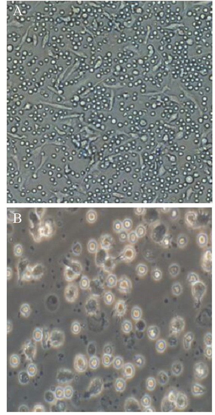| A: cultured for 5d (×200); B: cultured for 7d (×400) 图 1 CD133+肝癌细胞RNA-DC形态图 Figure 1 Morphology of dendritic cell loaded with CD133+ hepatocellular carcinoma cell RNA (CD133+ HCC RNA-DC) |
