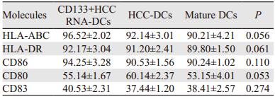 | 图 2 负载CD133+肝癌细胞RNA的DC抗原递呈相关分子表达情况 Figure 2 Phenotypes expression of CD133+ HCC RNA-DC |