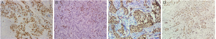 | A, C: strong positive expression of FOXM1 and PLK1 in breast carcinoma tissues, mainly in the cytoplasm and nucleus (IHC ×200); B, D: weakly positive expression of FOXM1 and PLK1 in breast carcinoma tissues (IHC ×100) 图 1 乳腺癌组织FOXM1及PLK1的染色结果 Figure 1 Expression of FOM1 and PLK1 in breast carcinoma tissues |