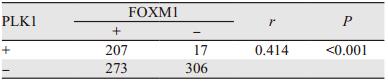 Spearman相关分析结果显示:FOXM1和PLK1在乳腺浸润性导管癌中的表达呈正相关关系(r=0.414, P < 0.01),见表 3。