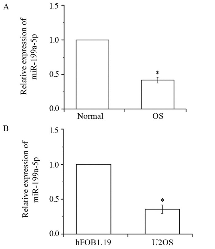 | x±s, *: P < 0.05, compared with adjacent normal tissues group 图 1 骨肉瘤及配对正常组织 (A) 人骨肉瘤细胞系U2OS及人成骨细胞系hFOB1.19(B) 中miRNA-199a-5p的表达水平 Figure 1 The expression of miRNA-199a-5p in osteosarcoma and adjacent normal tissues (A), human osteosarcoma cell lines U2OS and osteoblast cell lines hFOB1.19(B) |