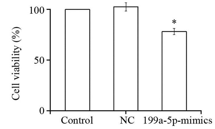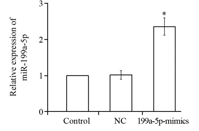 | NC: negative control group; x±s, n=6, *: P < 0.05, compared with control group 图 2 U2OS细胞转染miRNA-199a-5p mimics后miRNA-199a-5p的表达 Figure 2 The expression levels of miRNA-199a-5p in the U2OS cell after transfection of miRNA-199a-5p mimics |