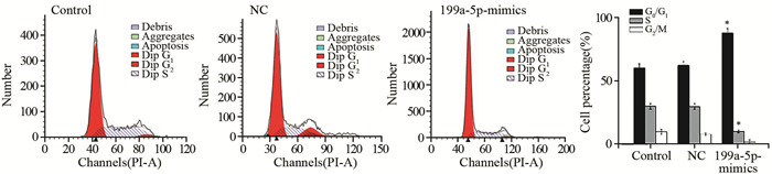 | x±s, n=6, *: P < 0.05, compared with control group 图 4 流式细胞术检测过表达miRNA-199a-5p后U2OS细胞周期的变化 Figure 4 The cell cycle of U2OS cells transfected with miRNA-199a-5p mimics analyzed by flow cytometry |
