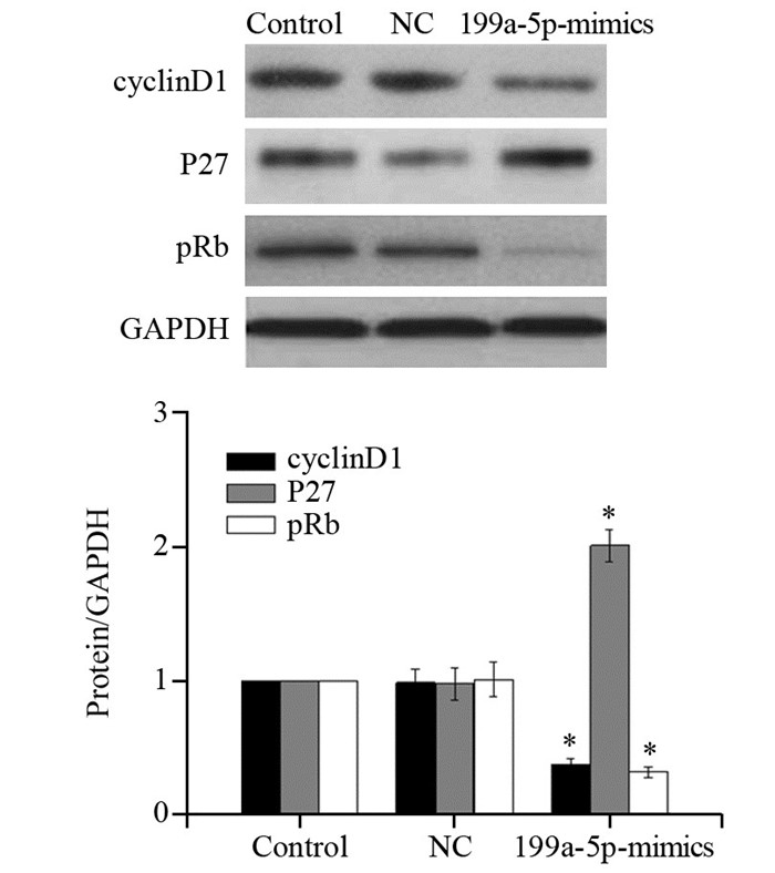 Western blot检测结果显示,转染miRNA-199a-5p mimics后细胞中cyclinD1、及pRb的表达显著降低(P=0.021, P=0.038),P27的表达则明显升高(P=0.003),见图 5。