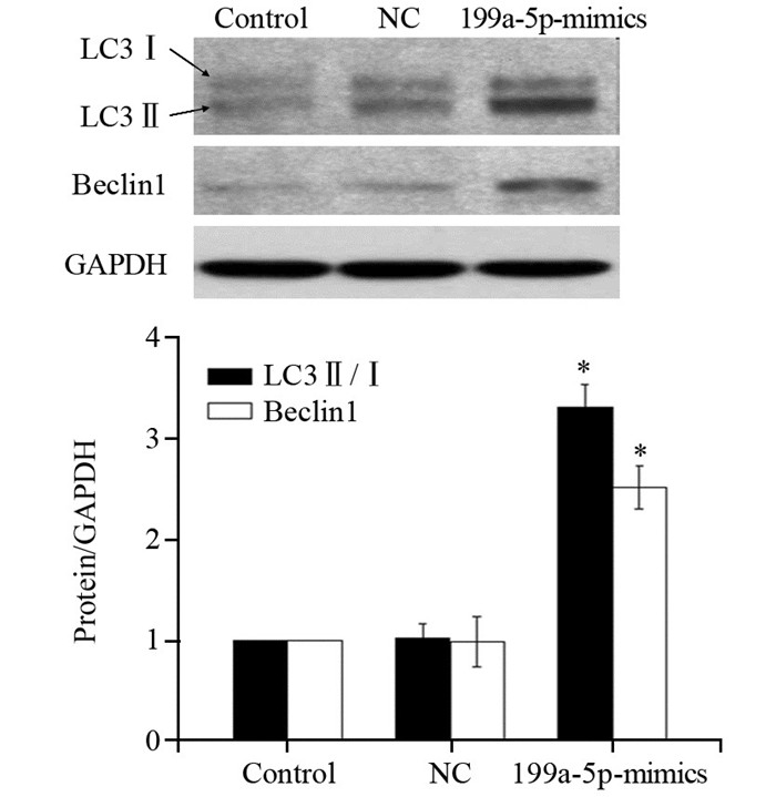 Western blot检测结果显示,转染miRNA-199a-5p mimics后细胞中Beclin1蛋白的表达显著增加(P=0.011),且LC3Ⅱ/Ⅰ的比值显著增加(P=0.002),见图 6。