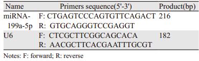 1.3.5 qRT-PCR检测蛋白相对表达量组织及细胞中总RNA的提取按照TRIzol一步法说明书进行。测定所提RNA样品在280 nm处的吸光度并定量。然后取2 μg总RNA以反转录酶催化合成cDNA,并采用SYBR Green实时荧光PCR的方法检测miRNA-199a-5p的表达。循环条件为95℃ 15 s,60℃ 30 s;72℃ 10 s,共45个循环;采用2-△△CT法分析基因的相对表达量。相应引物扩增的序列,见表 1。