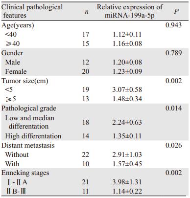 2 结果 2.1 miRNA-199a-5p在骨肉瘤组织及细胞中的表达RT-PCR结果显示:miRNA-199a-5p在骨肉瘤组织中的相对表达量是明显配对癌旁组织的(0.48±0.05)倍(P=0.009),见图 1A;在人骨肉瘤细胞系U2OS中miRNA-199a-5p的相对表达量是人正常成骨细胞系hFOB1.19的(0.36±0.06)倍(P=0.011),见图 1B。病理学资料统计分析显示:miRNA-199a-5p在骨肉瘤组织中的表达水平在年龄、性别因素组差异无明显统计学意义(P=0.943, P=0.789);而在肿块大小、远距转移、Enneking外科分期和病理分级因素组差异有统计学意义(P=0.002, P=0.026, P=0.002, P=0.014),见表 2。