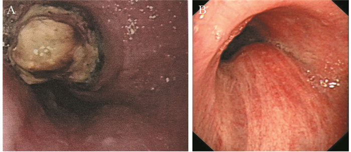 | A: large esophagus mass with surface nodules (July 10, 2015); B: the uplift in the left main bronchus for external pressure (July 22, 2015) 图 1 纵隔及左肺恶性肿瘤伴食管癌待排患者胃镜及纤维支气管镜图像 Figure 1 Gastroscopy and fibro bronchoscope images of mediastinal and left lung malignancy coupling with suspicion for esophagus cancer patient |