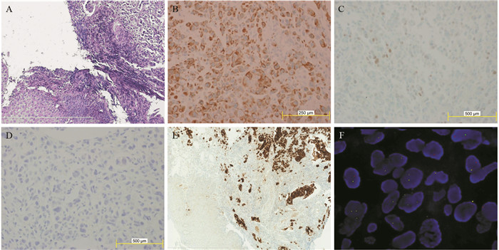 | A: tumor cells infiltrates the submucosa layer of the esophagous wall (Hematoxylin & Eosin stain, ×100); B: positive expression of CK7 in the tumor cells (×400); C: focal positive expression of TTF-1 in the tumor cells (×400); D: negative expression of NapsinA in the tumor cells (×400); E: positive expression of ALK-Ventana IHC in the tumor cells (×100); F: ALK gene translocation demonstrated by ALK-FISH detection 图 2 纵隔及左肺恶性肿瘤伴食管癌待排肿瘤组织病理图像 Figure 2 Pathological images of mediastinal and left lung malignancy coupling with suspicion for esophagus cancer tissues |