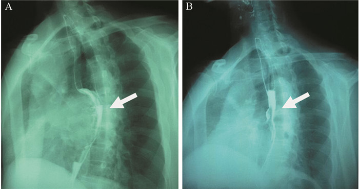 | A: esophageal lesions (arrow) before treatment (July 23, 2015); B: esophageal lesions (arrow) become smaller after treatment for 11 months (May 13, 2016) 图 3 纵隔及左肺恶性肿瘤伴食管癌待排患者食管造影图像 Figure 3 Digital X-ray barium meal radiography of mediastinal and left lung malignancy coupling with suspicion for esophagus cancer patient' s esophagus |