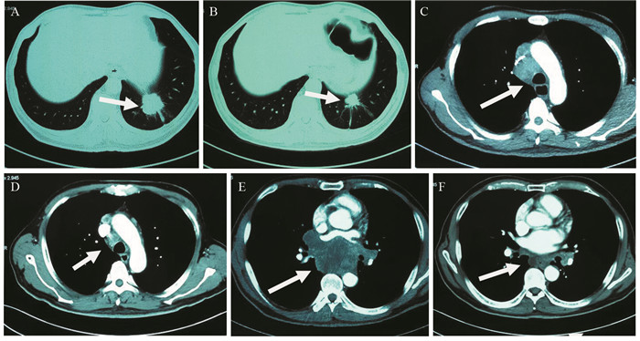| A: pulmonary lesions (arrow) before treatment (July 9, 2015); B: pulmonary lesions (arrow) become smaller after treatment for 11 months (July 4, 2016); C: enlargement of mediastinum and lung hilus lymph nodes (arrow)(July 9, 2015); D: mediastinum and lung hilus lymph nodes (arrow) become smaller after treatment for 11 months (July 4, 2016); E: mediastinal lesion (arrow) before treatment (July 9, 2015); F: mediastinal lesion (arrow) becomes smaller after treatment for 11 months (July 4, 2016) 图 4 纵隔及左肺恶性肿瘤伴食管癌待排患者治疗期间胸部CT图像上病灶的变化 Figure 4 The changes of lesions of chest CT images of mediastinal and left lung malignancy coupling with suspicion for esophagus cancer patient during the treatment |