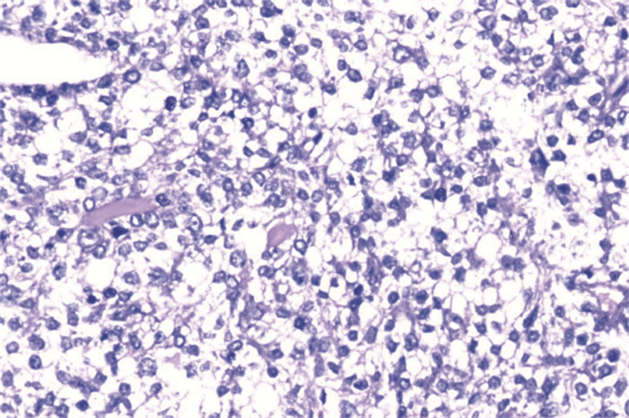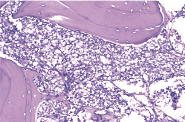 | 图 2 甲状腺透明细胞癌患者胸椎病变组织HE染色的镜下改变 (HE ×100) Figure 2 Lesion tissue in thoracic vertebrae of patient with clear cell carcinoma of thyroid gland observed under light microscope (HE ×100) |