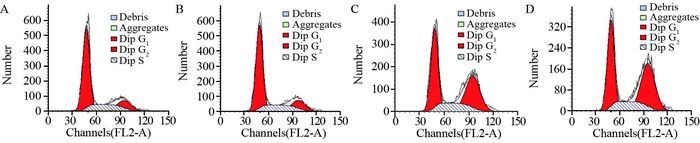 | A: HepG2; B: HepG2+X ray; C: HepG2-Cyclin G1-siRNA; D: HepG2-Cyclin G1-siRNA+X ray 图 4 Cyclin G1对肝癌细胞HepG2细胞周期的影响 Figure 4 Effect of Cyclin G1 on cell cycle of HepG2 cells |