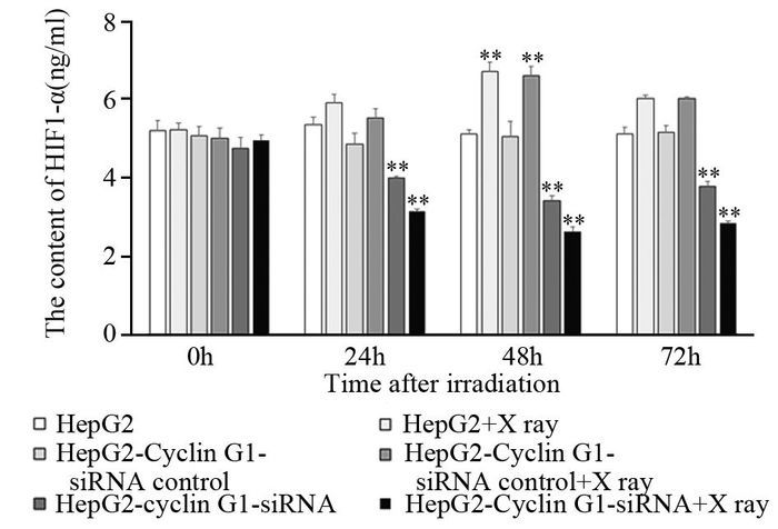 1.2.6 ELISA分析实验分为六组:HepG2组,HepG2-Cyclin G1-siRNA对照组,HepG2-Cyclin G1-siRNA组,HepG2+X线照射组,HepG2-Cyclin G1-siRNA对照+X线照射组,HepG2-Cyclin G1-siRNA+X线照射组。细胞接种后48 h,更换培养液,予以8 Gy照射,分别于照射后0、24、48、72 h洗涤细胞培养板,HIF-1α及ROS的测定均参照试剂盒要求,依次加入所需试剂,根据OD值绘制标准曲线,并计算所测样品中HIF-1α及ROS含量。