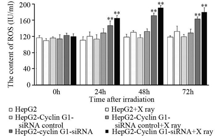 X线照射可引起肝癌HepG2细胞的HIF-1α升高,照射后48 h达到最高,并且与HepG2组相比差异有统计学意义,72 h后,HIF-1α轻度下降,而Cyclin G1-siRNA引起HIF-1α的含量显著下降,见图 6。ROS含量在X射线照射后表现为轻度升高,与照射前相比差异无统计学意义。过表达Cyclin G1-siRNA可以使ROS含量增加,照射后24 h开始升高,48 h后达到高峰,72 h轻度下降,与HepG2组细胞相比具有统计学意义,见图 7。