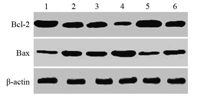 | 1: HepG2; 2: HepG2+X ray; 3: HepG2-Cyclin G1-siRNA; 4: HepG2-Cyclin G1-siRNA+X ray; 5: HepG2-Cyclin G1-siRNA control; 6: HepG2-Cyclin G1-siRNA control+X ray 图 8 Cyclin G1及X线对肝癌细胞HepG2凋亡相关蛋白表达的影响 Figure 8 Effect of Cyclin G1 and X-ray on expression of apoptosis-related proteins in HepG2 cells |