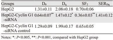 1.2.5 成克隆分析取对数生长期细胞,消化离心制成1×104/ml单细胞悬液,按照预实验结果将不同细胞数接种至6孔板中,具体为:0 Gy及2 Gy的照射剂量均接种200个细胞,4 Gy及6 Gy的照射剂量接种400个细胞,8 Gy的照射剂量接种800个细胞。分为HepG2组,HepG2-Cyclin G1-siRNA组及HepG2-Cyclin G1-siRNA对照组。细胞接种后48 h,实验分别接受0、2、4、6、8 Gy的6 MV的X射线照射,继续培养14 d,-20℃冰甲醇固定10 min,0.05%结晶紫在室温下染色30 min后双蒸水小心洗涤3次,空气干燥。倒置显微镜下进行细胞计数,≥50个细胞集落作为1个克隆。实验重复3次,计算克隆形成率(PE)=克隆数/接种细胞数×100%,存活分数=照射各剂量点PE/0GyPE。按多靶单击模型SF=1-(1-e-K*D)N,使用Graphpad 5软件拟合细胞存活曲线,得出K值和N值,计算单独照射组和联合组的SF2、D0和Dq值,并计算放射增敏比(SER)。