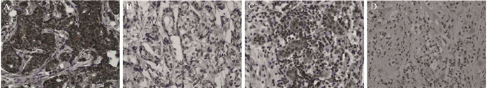 | Strongly positive expression of UBQLN1 in invasive ductal(A) and invasive lobular breast cancer tissues(C) and weakly positive expression of UBQLN1 in invasive ductal(B) and invasive lobular breast cancer tissues(D) 图 1 乳腺癌组织中UBQLN1的染色结果(IHC ×400) Figure 1 Expression of UBQLN1 in breast cancer tissues (IHC ×400) |