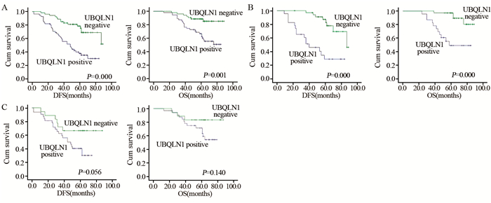 UBQLN1在淋巴结阳性组中阳性表达率为64%(32/50),在淋巴结阴性组中阳性表达率为39.7%(23/58),差异有统计学意义(χ2=6.368, P=0.012);UBQLN1在有远处转移组中阳性表达率为71.7%(27/38),在无远处转移组为40%(28/70),差异有统计学意义(χ2=9.503, P=0.002)。进一步行生存分析,在淋巴结阳性组,UBQLN1阳性组与阴性对照组间预后差异无统计学意义(DFS: P=0.056; OS: P=0.140)。然而,在淋巴结阴性组,UBQLN1阳性组与阴性对照组相比,DFS和OS显著降低(DFS: P=0.000; OS: P=0.000),见图 2。