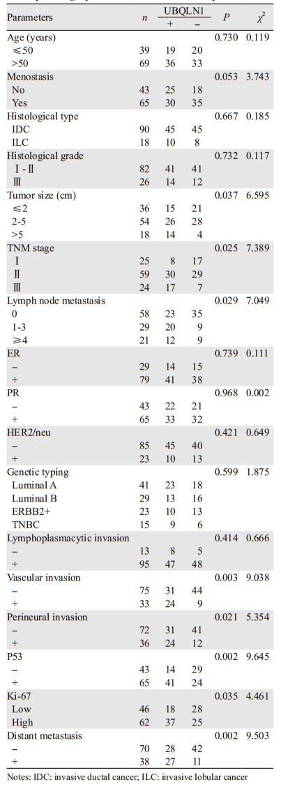乳腺癌是全球女性中最常见的恶性肿瘤,在女性癌症相关死亡中居第二,严重威胁着女性的健康[1-2]。但目前对其发生、发展的精确分子机制尚不完全清楚。因此,探索可用于预测乳腺癌复发风险、评估预后的分子生物学标志极其重要。UBQLN1是一种泛素样蛋白质,在调节蛋白酶体降解过程中发挥核心作用[3]。近些年来研究发现其通过促进错误折叠蛋白质降解、参与内质网应激相关降解(ERAD)[4]、自噬[5-6]、细胞凋亡[7]和受体转运[8]等多种机制对肿瘤的迁移和侵袭等生物学特性产生重要影响。国内有关UBQLN1与乳腺癌方面的研究罕见报道。本研究通过检测UBQLN1在乳腺癌中的表达,探讨其与临床病理特征及预后的相关性,分析UBQLN1在乳腺癌浸润、转移中的重要作用,以期为判定乳腺癌预后及指导临床治疗提供新的思路。
