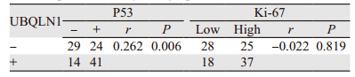 经Spearman秩相关检验得出UBQLN1的表达与P53的表达呈正相关(r=0.262,P=0.006);与Ki-67的表达不相关(r=-0.022,P=0.819),见表 2。