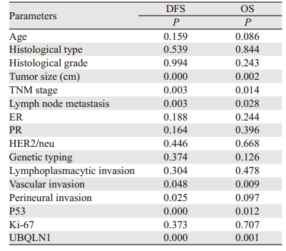 综上所述,本研究提示UBQLN1蛋白表达与乳腺癌密切相关,且其阳性表达与乳腺癌预后不良有关,可作为乳腺癌的独立预后因子,对评估乳腺癌生物学行为及进展程度可能具有一定的临床价值。