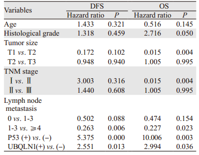 本研究中UBQLN1阳性表达与乳腺癌肿瘤大小、临床TNM分期、淋巴结转移个数等临床病理学指标明显正相关,这也进一步证实UBQLN1的表达与乳腺癌的侵袭和转移密切相关。乳腺癌中UBQLN1与P53的表达呈正相关,提示P53与UBQLN1基因的异常共同参与了乳腺癌的发生,两者在乳腺癌发展过程中可能起协同作用。这与Guidi等[15]发现在卵巢癌细胞系中,UBQLN1蛋白可抑制P53蛋白降解,可能与介导卵巢癌的顺铂耐药一致。但两者在乳腺癌中的具体作用机制尚未见报道,有待于进一步的实验研究证实。此外UBQLN1表达与淋巴结转移和远处转移具有更密切的关系,免疫组织化学及单因素生存分析等结果也证实了这一点。Kaplan-Meier单因素生存分析和Cox多因素回归分析均表明,UBQLN1阳性表达患者较阴性表达者的DFS和OS明显下降,UBQLN1是乳腺癌独立的预后因素。