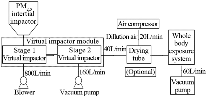 1.3 动物全身PM2.5暴露系统设备连接及气体流向,见图 1。