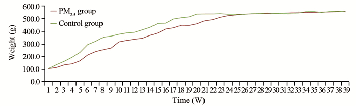 动物分组:实验组:PM2.5采集器,按抽气量50 L/min,完全PM2.5富集量,理论PM2.5浓度为外部空气中PM2.5浓度的10倍;对照组:正常饲养,大鼠饲养于PM2.5 < 35 μg/m3的洁净环境中。染毒动物每日染毒4 h,一周染毒5次。每组Wistar大鼠20只,共染毒9月,其余时间与对照组饲养于同一环境中。每日观察大鼠饮食及饮水情况,每周测量大鼠体重。