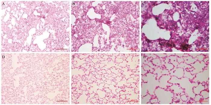 | A, B, C: PM2.5 group; D, E, F: control group; A, D: ×100; B, E: ×200; C, F: ×400 图 5 HE染色观察肺组织形态 Figure 5 Morphology of lung tissues observed by HE staining |