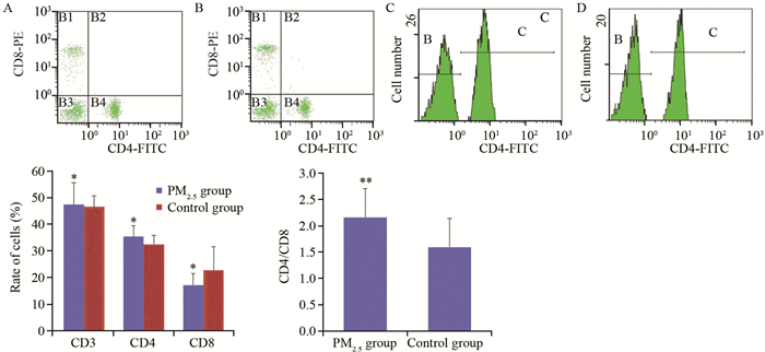 | A, C: PM2.5 group; B, D: control group; *: P > 0.05 compared with control group; **: P < 0.05 compared with control group 图 6 流式细胞术检测Wistar大鼠静脉血CD3、CD4、CD8表达水平 Figure 6 Expression of CD3, CD4 and CD8 in venous blood of Wistar rats detected by flow cytometry |