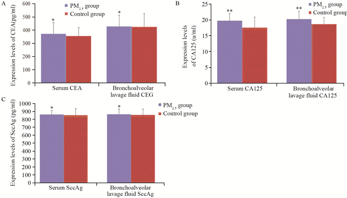 | *: P > 0.05, compared with control group; **: P < 0.05, compared with control group 图 7 ELISA实验检测Wistar大鼠血清及肺灌洗液中CEA、CA125及SccAg表达水平 Figure 7 Expression levels of CEA, CA125 and SccAg in serum and lung lavage fluid of Wistar rats detected by ELISA assay |