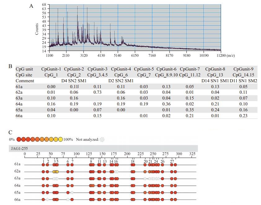| A : MALDI-TOF-MS mass spectrum of a sample from IDC; B: methylation percentage of CpG site in IDC group; C: methylation levels of CpG loci in IDC group 图 1 JAG1基因甲基化质谱图及定量分析 Figure 1 Mass spectrometry and quantitative analysis of JAG1 gene methylation |