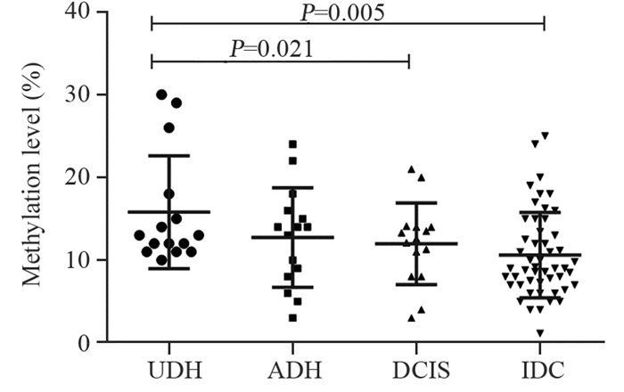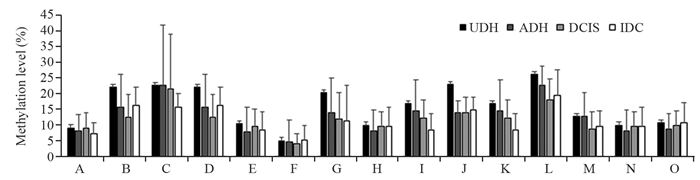 | UDH: usual ductal hyperplasia; ADH: atypical ductal hyperplasia; DCIS: ductal carcinoma in situ; IDC: invasive ductal carcinoma 图 2 JAG1基因总甲基化率在乳腺UDH、ADH、DCIS、IDC组中的变化 Figure 2 Overall methylation rates of JAG1 gene in usual ductal hyperplasia(UDH), atypical ductal hyperplasia(ADH), ductal carcinoma in situ (DCIS), and invasive ductal carcinoma (IDC) groups of breast tissues |