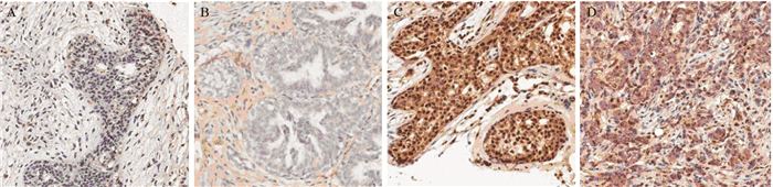 | A: UDH; B: ADH; C: DCIS; D: IDC 图 4 JAG1蛋白在乳腺UDH、ADH、DCIS、IDC组中的表达(SP×200) Figure 4 Expression of JAG1 protein in UDH, ADH, DCIS and IDC groups of breast tissues (SP×200) |