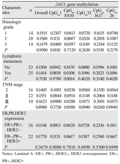 在48例乳腺癌组织中,JAG1基因总甲基化水平在乳腺癌高分级、淋巴结转移、低分期和Luminal A型(ER+,PR+,HER2-)组中是降低的,但没有统计学意义。然而就单个CpG位点而言,CpG_1甲基化水平从1级到2级至3级逐渐降低且差异有统计学意义(P=0.011);CpG_8.9.10位点甲基化率在无腋窝淋巴结转移组显著高于有腋窝淋巴结转移组(P=0.0014);CpG_16.17位点甲基化率从Ⅰ期到Ⅱ期至Ⅲ期呈逐渐升高趋势且差异有统计学意义(P=0.026);CpG_13、CpG_26位点甲基化在Luminal A型组明显低于HER2过表达组(ER-,PR-,HER2+)(均P=0.049),见表 1。