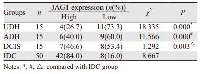 分析JAG1蛋白在四组中的表达,结果发现JAG1蛋白在四组中的表达逐渐升高,差异有统计学意义(P=0.015)。四组之间两两比较,UDH、ADH和DCIS组分别与IDC组比较差异有统计学意义,见表 2。
