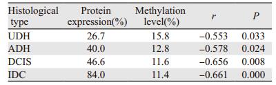 从UDH到IDC这一癌变过程中的JAG1蛋白表达率逐渐升高,同时相对应组中的甲基化水平逐渐降低,JAG1蛋白在四组中的总表达水平与基因总甲基化水平之间呈显著负相关(r=-0.674, P < 0.001),并且每一组中蛋白表达和甲基化水平也呈显著负相关,见表 3。