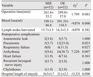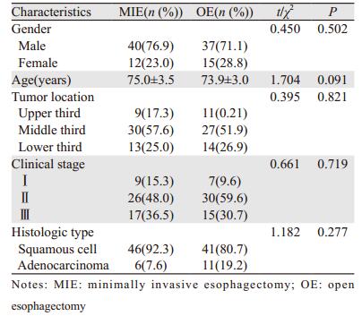 1 资料与方法 1.1 一般资料对苏州大学附属第一人民医院和南京医科大学附属苏州市立医院胸外科2013年2月至2016年8月所实施MIE及OE手术的高龄患者分两组:MIE组(Ivor-Lewis或McKeown术式)、OE组(Sweet、Ivor-Lewis或McKeown术式),每组分别随机挑选52例,两组患者一般临床资料见表 1。入组标准:(1)患者行MIE或OE术;(2)年龄≥70岁,性别不限;(3)术前胃镜及病理检查明确诊断;(4)术前行胸部CT及腹部B型超声排除远处转移,常规评估心肺功能排除手术禁忌证;(5)术前未进行新辅助化疗或放疗;(6)剔除姑息性手术切除患者。