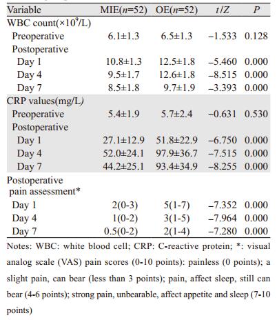 电视辅助胸部微创手术(video-assisted thoracic surgery, VATS)方式的出现与革新极大改变了胸部手术的治疗方式。随着腔镜技术及器械的迅速发展,胸腹腔镜联合微创行食管癌根治术(MIE)得到广泛应用[11-12]。MIE通过胸、腹壁微小手术切口进行手术操作,从而避免胸腹壁切断较长肌肉组织、肋骨撑开,减轻肋间神经及胸腹腔内邻近组织器官的损伤,从而显著减轻术后疼痛以及手术后创伤应激。通过对两组术后WBC、CRP的监测及术后疼痛评估进行比较,结果显示MIE组与OE组有显著性差异,从而证实MIE可明显减轻高龄患者术后疼痛,并显著降低手术创伤及应激所导致的全身炎性反应。