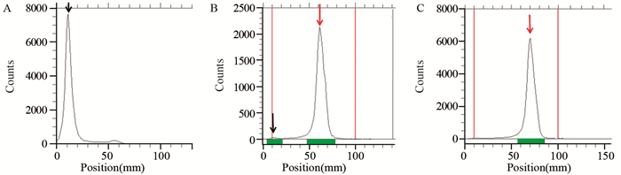 | The black arrow showed the distance of 68Ga3+ peak position to the point; The red arrow represented the 68Ga-PSMA-617 peak position; A: 68GaCl3; B: 68Ga-PSMA-617 before purification (98.85%); C: 68Ga-PSMA-617 after purification(99.99%) 图 1 68GaCl3以及68Ga-PSMA-617标记产物纯化前后的radio-TLC分析 Figure 1 Radio-TLC analysis of 68GaCl3 and 68Ga-PSMA-617 before and after purification |