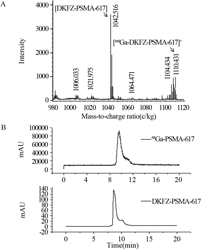 将冷镓标记化合物进行MALDI-TOF-MS分析,在对应分子质量处可见标记化合物,证实镓与前体的良好结合,见图 2A。此外,将前体DKFZ-PSMA-617与放射性标记产物共进样进行HPLC分析,可见放射性出峰时间(t=9.647)与前体的紫外出峰时间(t=8.598)的一致性,证实68Ga与前体DKFZ-PSMA-617的结合,见图 2B。
