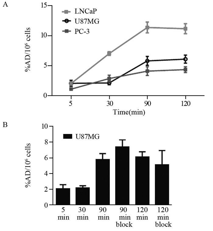 1.2.4 细胞水平实验选择PSMA高表达的前列腺癌LNCaP细胞、PSMA低表达的前列腺癌PC-3细胞作为对照,以研究U87MG细胞对PSMA靶向分子探针是否有摄取,从而判断该细胞有无PSMA高表达。将处于对数生长期的LNCaP、PC-3以及U87MG细胞进行胰酶消化,收集细胞后进行细胞计数,取2×105~1×106细胞加至24孔板中并于37℃、4%CO2培养箱中孵育24~48 h,之后进行标记化合物68Ga-PSMA-617在LNCaP、PC-3以及U87MG细胞株中的细胞摄取实验。实验前2 h将含FBS的培养液更换为不含FBS的RPMI 1640和DMEM培养液,阻滞组加入每孔1 mg PSMA抑制剂ZJ-43以评价分子探针68Ga-PSMA-617的PSMA靶向特异性。在24孔板的每孔中加入37 kBq(1 µCi)68Ga-PSMA-617后置于CO2培养箱分别孵育5、30、90、120 min,便用冷PBS(0.5 ml×2次)冲洗以结束摄取进程,后消化细胞并收集至γ-counter管中进行放射性计数测定。同时取0.37 kBq(0.01 µCi)68Ga-PSMA-617作为参考进行放射性计数测定,用Prism 6.0软件进行数据分析。使用独立样本t检验对计量资料间有无统计学差异进行分析。