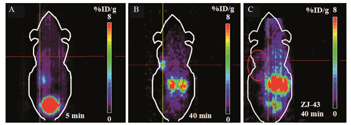 | A, B: the PET images of U87MG mice were obtained 5 min and 40 min after tail injection of 7.4 MBq 68Ga-PSMA-617; C: PET imaging of U87MG mice was obtained 40 min after co-injection of PSMA inhibitor ZJ-43 and 68Ga-PSMA-617. The cross showed the center of tumor in A and B, and the margin of the tumor in C; the circle in C showed the whole tumor outline 图 4 68Ga-PSMA-617在U87MG的micro-PET显像 Figure 4 Micro-PET images of 68Ga-PSMA-617 in U87MG bearing mice |
