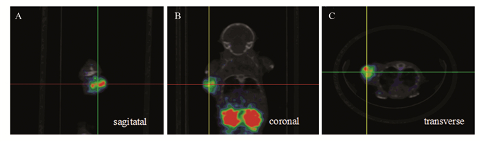 | The cross showed the tumor position. The PET and CT fusion imaging of U87MG mice were obtained 40 min after 68Ga-PSMA-617 injection; A: the sagittal plane; B: the coronal plane; C: the transverse plane 图 5 利用micro-PET/CT对U87MG荷瘤鼠的68Ga-PSMA-617分布进行融合显像(40 min) Figure 5 micro-PET/CT images of 68Ga-PSMA-617 in U87MG bearing mice obtained 40 min after injection |