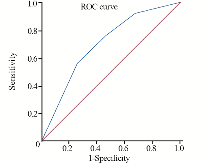 将疗效的多因素分析中有意义的NLR与LDH指标进行联合,使用Logistic回归分析求出预测概率P,最后对P进行ROC曲线面积分析。结果显示,NLR联合LDH的AUC为0.698(95%CI: 0.595~0.801)(P=0.001),见图 1。