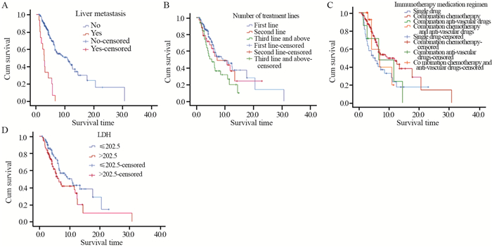 所有患者中位PFS为7.3月,无肝转移患者较肝转移患者PFS明显延长(10.7月vs. 2.7月,P=0.000); 接受一线免疫治疗的患者较接受三线及以上治疗的患者PFS明显延长(9.3月vs. 5.4月,P=0.042); 接受免疫联合化疗治疗的患者较免疫单药治疗的患者PFS明显延长(9.3月vs. 4.7月,P=0.038); 免疫治疗前LDH≤202.5 u/L的患者较LDH > 202.5 u/L的患者PFS明显延长(10.7月vs. 6.4月,P=0.031),见图 2。